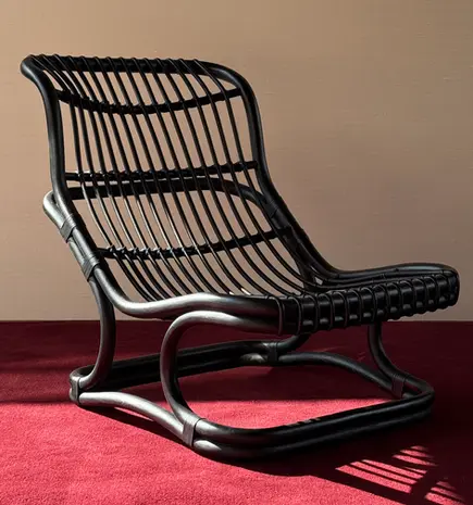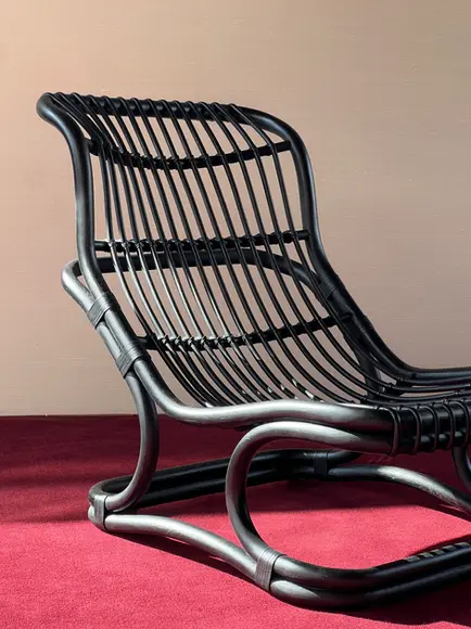 An exceptional armchair and footstool designed by Tito Agnoli for Bonacina in 1963. Black stained rattan. Comes with its own cushions.